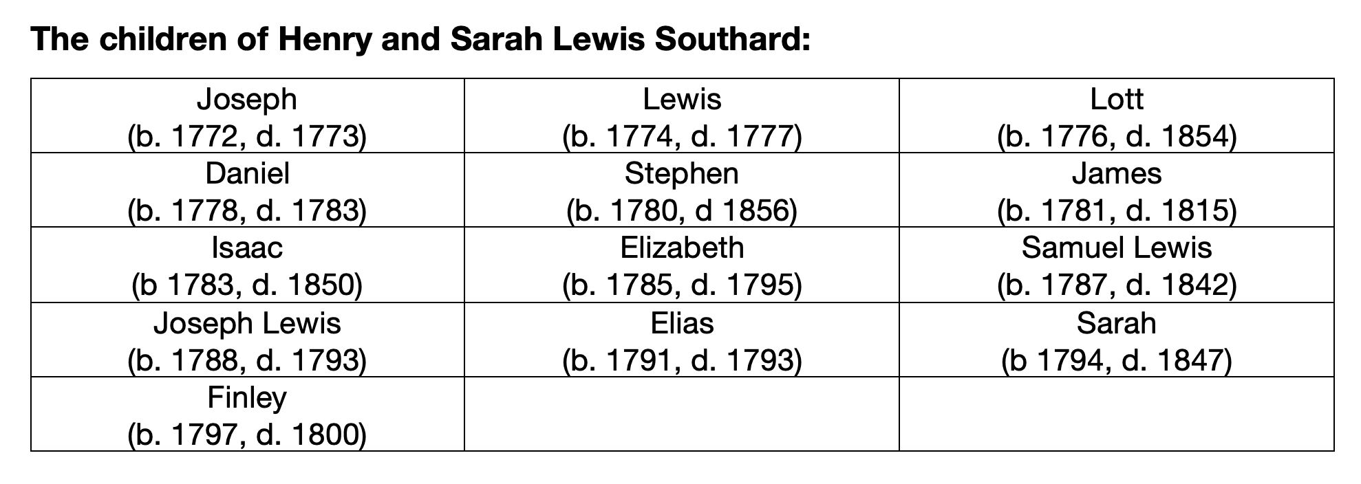 Born in Long Island in 1747, Henry Southard moved to Basking Ridge from Long Island as an 8 year old boy in 1755. He worked on his parents’ (Abraham and Cornelia) farm and in 1771 married his 15 year old neighbor Sarah Lewis (b 1756, d. 1831). Sarah was the daughter of Edward Lewis, and granddaughter of Daniel Morris – both previous owners of the farm. They would have 13 children, with only 6 of them living into adulthood (the last 6 children were all born on the BSR Estate). It is hard to imagine that by the time she turned 21, Sarah had given birth to 3 sons, and buried 2 of them. Three of the Southard children (Stephen, Isaac, and Sarah) married siblings of the neighboring Doty family.
