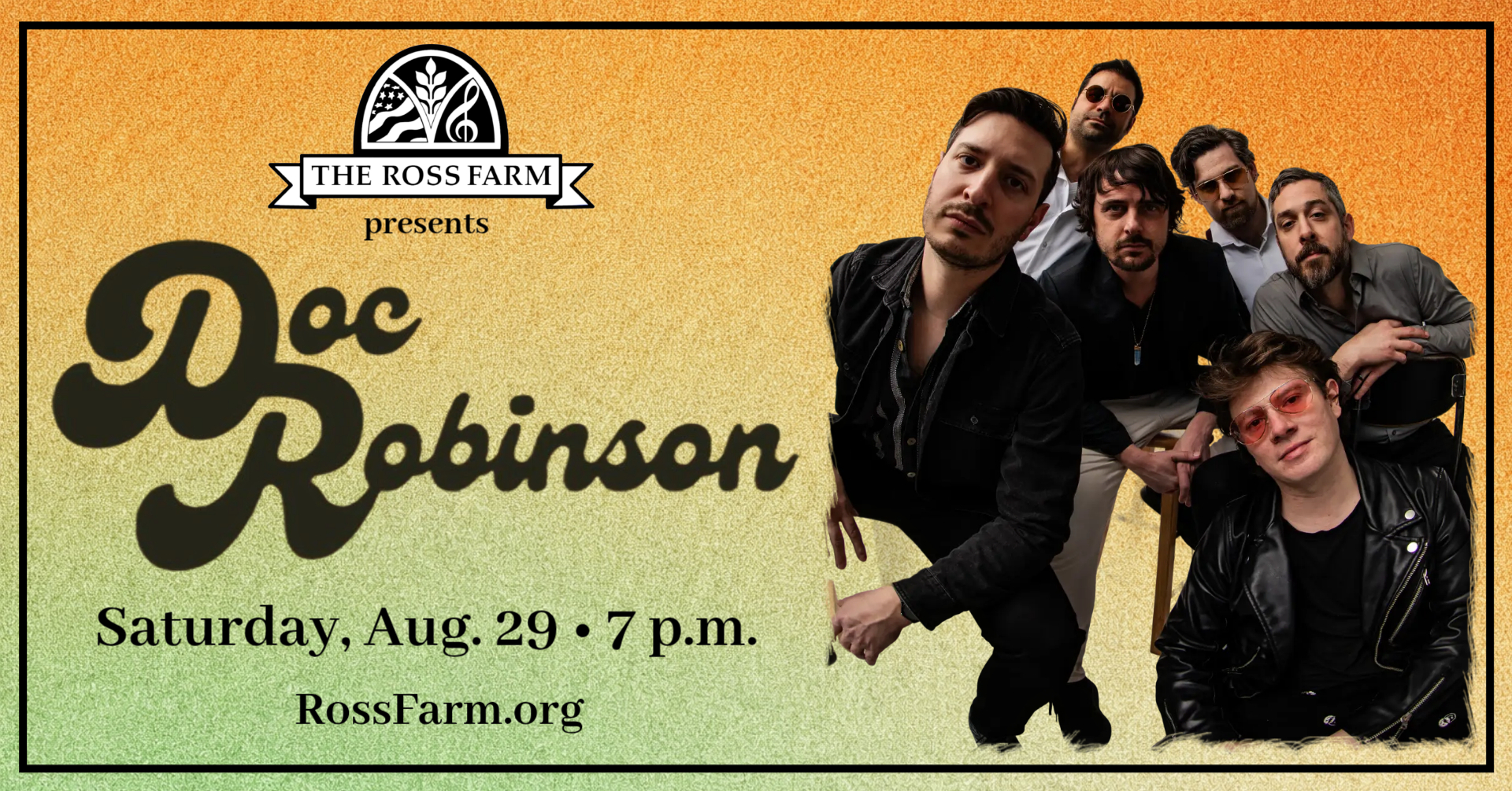 Fronted by the commanding tenor vocals of Jon Elliott, Doc Robinson delivers a sound that’s equal parts song-driven storytelling, heartbreak harmonies, and feel-good groove. Named for early influences Dr. Dog and Smokey Robinson, the band has grown into something all their own - a genre-blending, midwestern gumbo that’s as infectious as it is soulful. Known for their captivating live shows, Doc Robinson draws audiences in with an easy charm, tight musicianship, and an energy that feels just right for a late August night under the open sky. Since forming in Columbus, OH, they’ve become a rising force in the indie music scene, touring nationally with artists like Caamp, Neal Francis, and The Brook and the Bluff, and landing songs in series including The Walking Dead and BoJack Horseman. Join us at the historic Ross Farm for one more summer evening of live music - bring your chairs or blankets, pack a picnic, and settle in for a night that captures the spirit of the season. Doors open at 6 for the 7 p.m. concert.